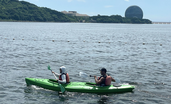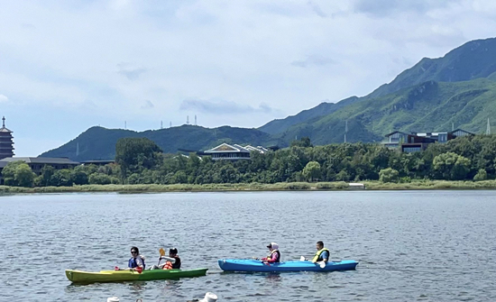 上午,雁栖湖水上运动基地组织体验皮划艇项目👩🏽🎤🏢。大家仔细了解救生衣的正确穿戴、安全救助和基本划桨动作之后,在教练的协助之下两两一组进入皮划艇内⏰,相互配合着划动双桨驶离码头,划向远处的湖面,充分体验这项运动的魅力🎿。